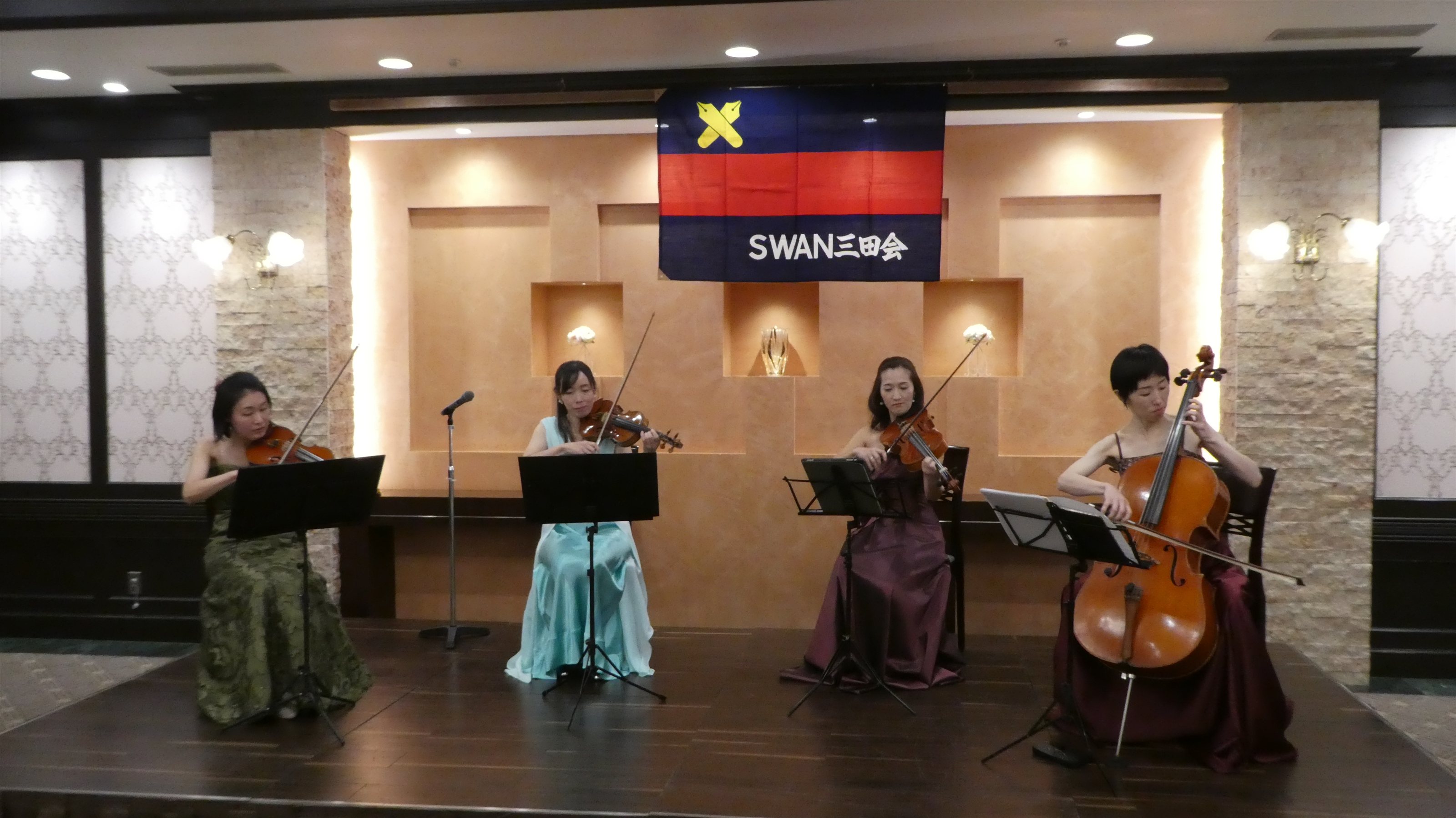 その後、アトラクションの弦楽四重奏の演奏、音楽クイズでひとときを楽しみました。恒例の福引きは、参加者の4歳のお子さんに福引き役を務めてもらい、場がなごみました。